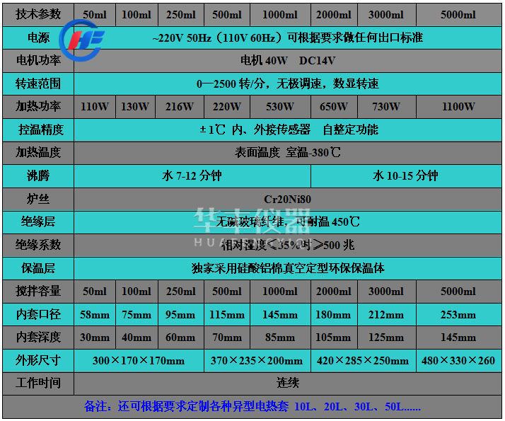 1.采用電熱套加熱,具有受熱面積大、均勻、升溫快的特點,溫度380℃。 2.可對50-10000ml標準或非標準反應瓶進行加熱攪拌。 3.采用德國PAPST系列直流無刷電機,性能穩定,噪音小,壽命長,無火花產生。